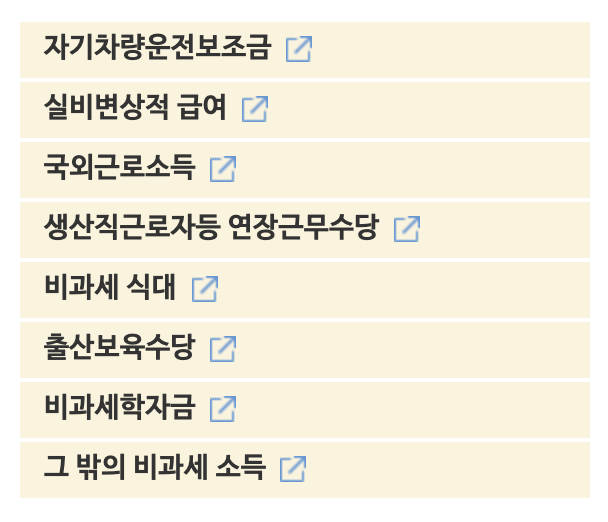 비과세 소득은 아래와 같은 예시들이 있으며 상세 내용은 국세청의 정보를 참고하는 것을 추천한다.