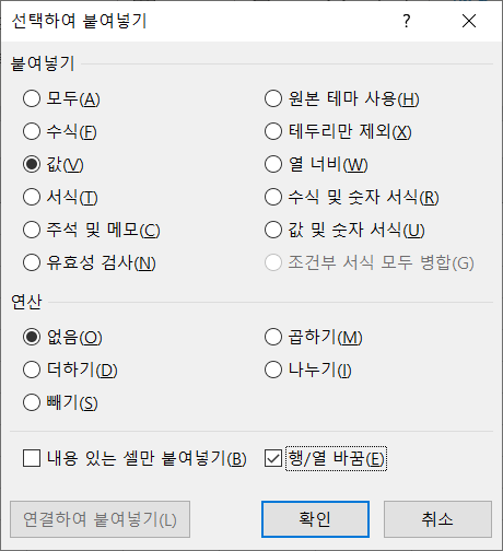 나처럼 값만, 행/열 바꿈을 적용하기 원한다면 v , e를 누르고 Enter