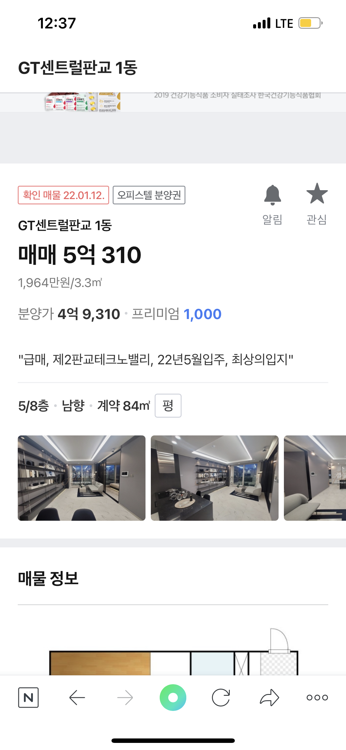 그 옆에 바로 들어오는 GT센트럴판교 가격도 별반 차이 없이 4억 후반대로 형성되어 있었으며 프리미엄은 1천만원 정도 붙어있었다